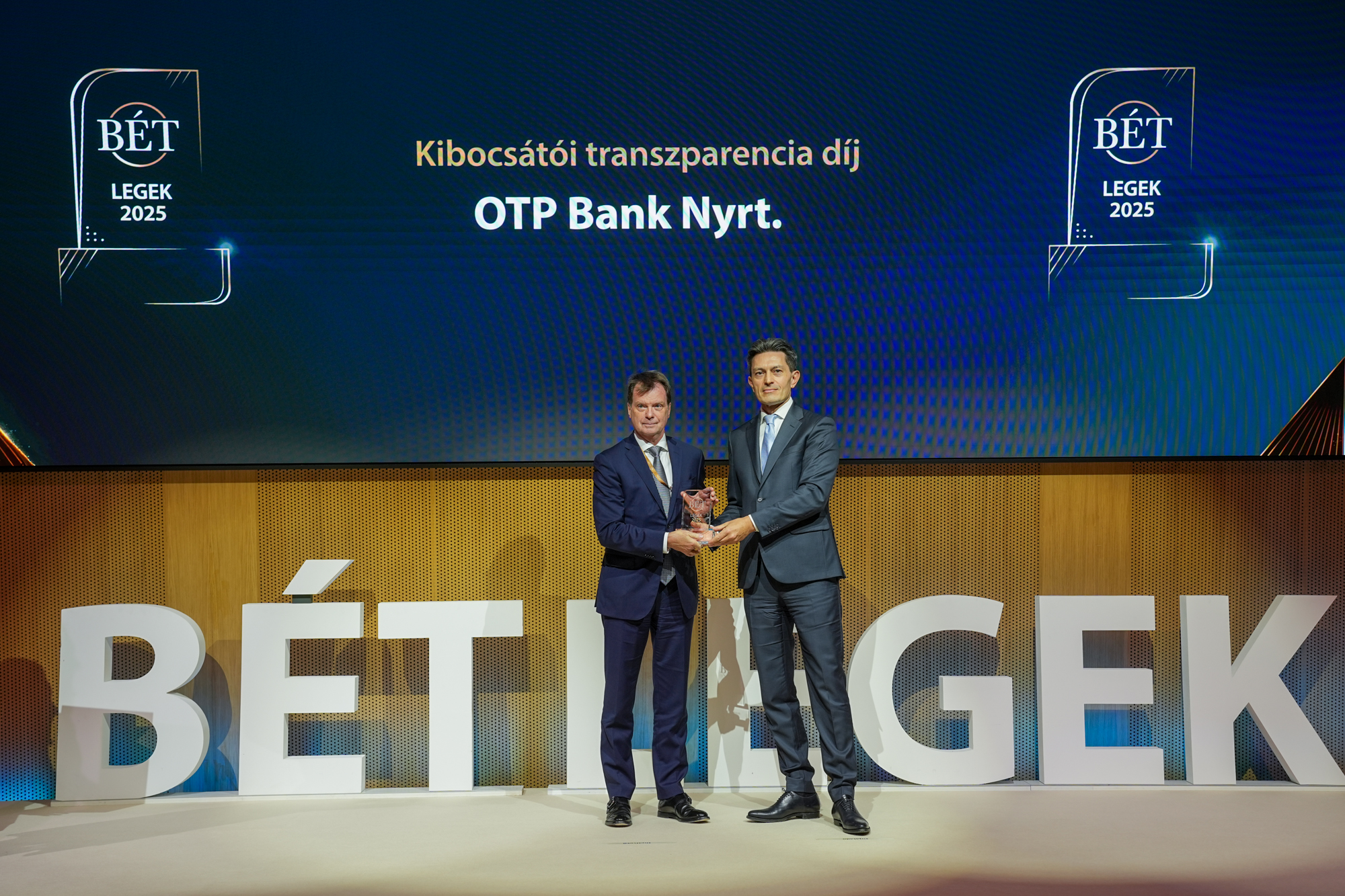 A 2025. évi teljesítménye alapján az OTP Bank kapta a legtöbb elismerést az idei BÉT Legeken, összesen négy díjjal büszkélkedve. A hitelintézet nyerte el „Az év befektetési szolgáltatója”„Az év legnagyobb forgalmat elért részvénykibocsátója”, a „Kibocsátói transzparencia díj” és a „Felelősségvállalás, fenntarthatóság, felelős vállalatirányítási díj” kategóriákat. A legnagyobb forgalmat elért részvénykibocsátók rangsorában az OTP Bankot a Richter Gedeon követte a második, a MOL pedig a harmadik helyen.